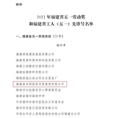 近日,省總工會通報表彰了2021年福建省五一勞動獎和福建省工人 (五一) 先鋒號,福建省水利投資開發(fā)集團有限公司榮獲福建省五一勞動獎狀。